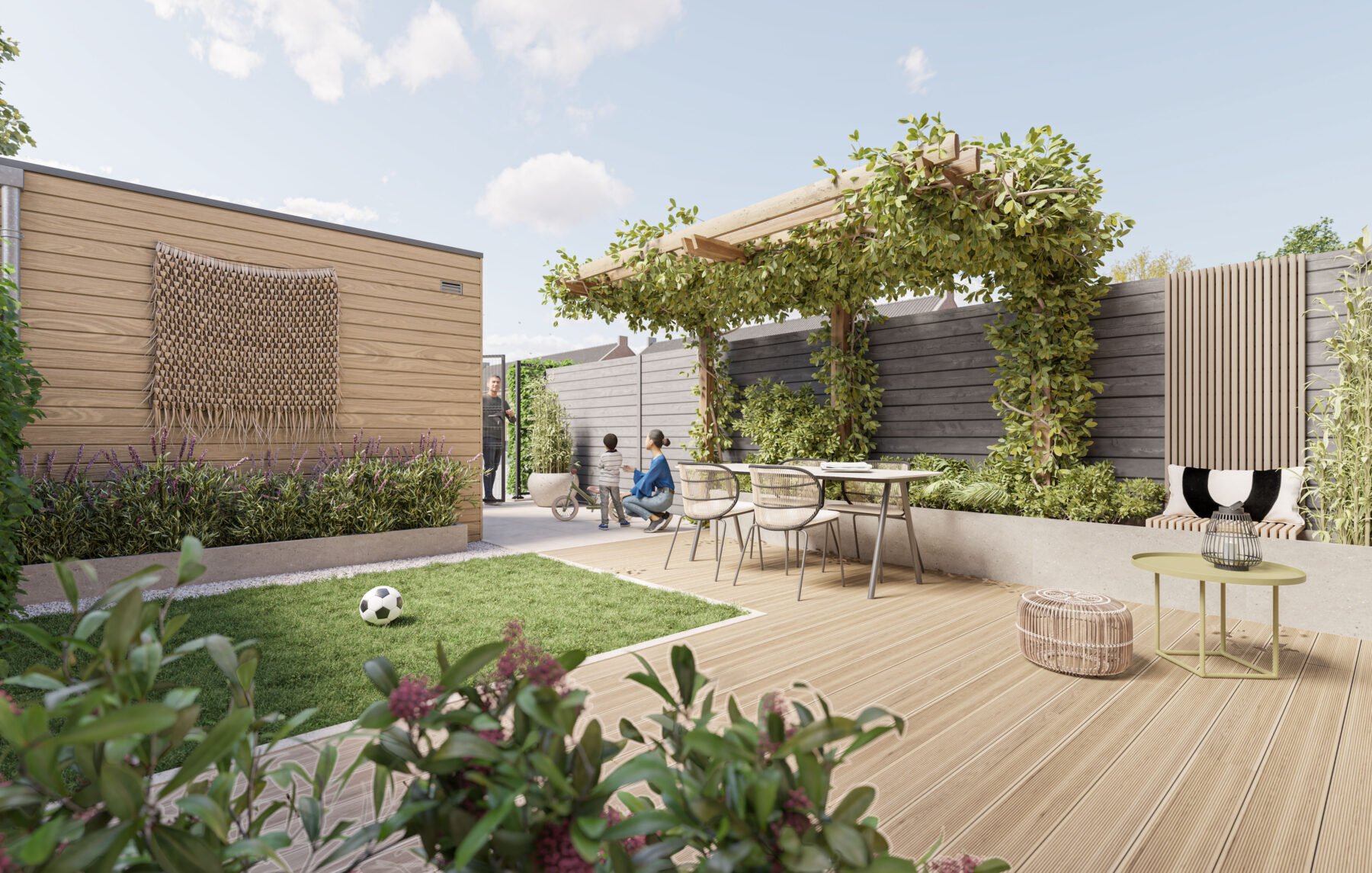De tuin van bouwnummers 96 t/m 84 ligt op het noordwesten, waar het ook fijn vertoeven is.