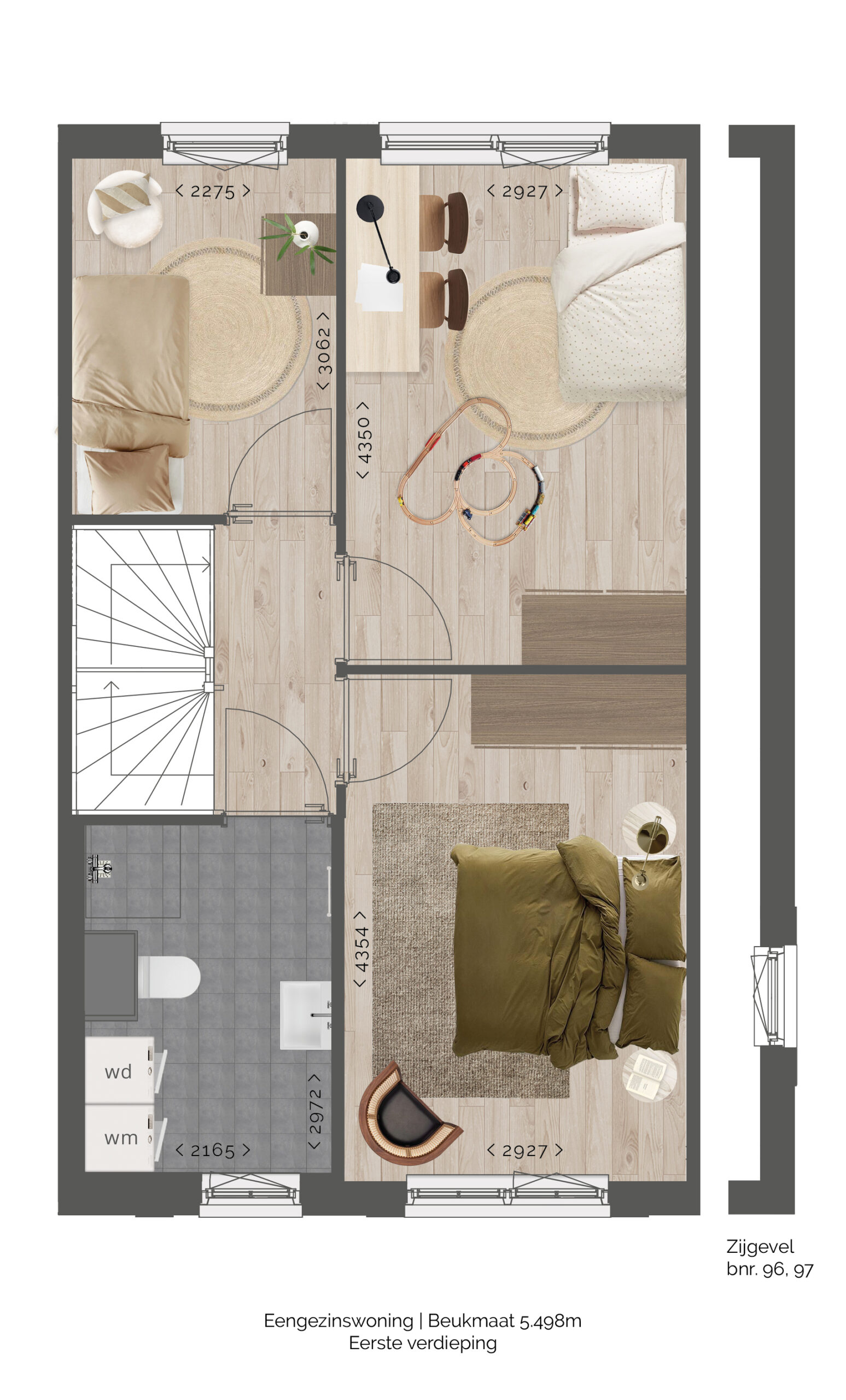 Standaard heeft dit type woning drie slaapkamers, een badkamer en een royale zolderruimte, die optioneel is in te delen in bijvoorbeeld een extra slaapkamer.